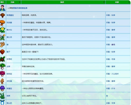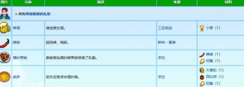 所有普遍喜歡的禮物(除了腌菜)、所有雞蛋(除了虛空蛋)、所有水果(除了辣椒)