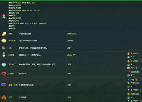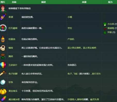 奶酪、山羊奶酪、石頭、冰淇淋、大米布丁、紅莓醬、藍(lán)莓千層酥、餅干、大黃派、粉紅蛋糕、巧克力蛋糕、面包、薄煎餅、薯餅、琉璃山藥、披薩、炒蘑菇、山洞蘿卜、浮木、大麥粉、油、虛空蛋、工作小食、醋、大米、晶球、冰封晶球、巖漿晶球、橡樹(shù)樹(shù)脂、松焦油、萬(wàn)象晶球、未碾米