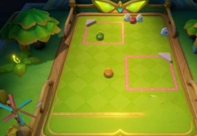 2、具體打法:先用貼貼球?qū)蓧K石頭中間的雀雀球放入得分區(qū),將普通球放到得分區(qū)中,最后將華麗球打入紅色得分區(qū)中即可。