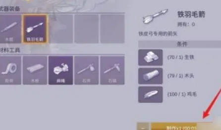 3、然后需要點擊武器裝備下方的鐵羽毛箭,就會在右側看到制作條件。