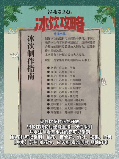 江南百景圖如何做冰飲?炎炎夏日多想來一份冰飲解解暑,在江南百景圖這款游戲中,玩家也是可以去做美味涼爽的冰飲的,只要找到一些材料就可以做出來,只不過這些材料的獲取方法有點困難,需要我們一起到江南百景圖里面探索尋找,下面就是我分享的一些配方,希望對你有所幫助。