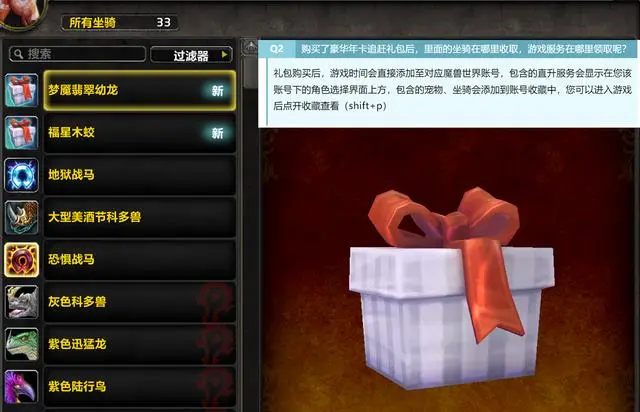 888禮包內(nèi)包含懷舊服坐騎和正式服坐騎,懷舊服玩家購(gòu)買禮包之后,上線就可以在收藏界面看到禮品盒子,點(diǎn)擊之后就可以看到兩款坐騎了。這些坐騎和小寵物都是戰(zhàn)網(wǎng)共享的。