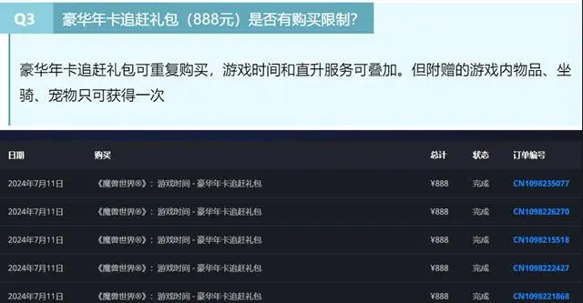 絕大部分玩家都只買一個(gè)888禮包,但是也有玩家入手了多個(gè)888禮包,而針對(duì)這種多次購(gòu)買的情況,官方的答復(fù)是888禮包是可以重復(fù)購(gòu)買的,禮包內(nèi)的游戲時(shí)間和直升服務(wù)是可以疊加的,坐騎和小寵物則只能獲得一次。