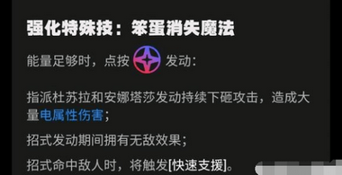 效果:觸發(fā)連攜技時(shí),選擇對(duì)應(yīng)角色發(fā)動(dòng),用歌聲引導(dǎo)能量轟擊,造成大量以太傷害。招式發(fā)動(dòng)后,進(jìn)入演唱狀態(tài),并且招式發(fā)動(dòng)期間擁有無(wú)敵效果。