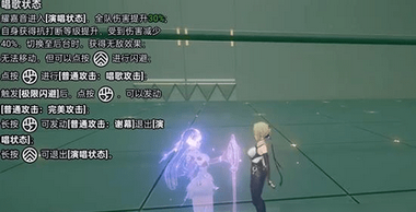 效果:進(jìn)入演唱狀態(tài)后,全隊(duì)傷害提升30%,自身獲得抗打斷等級(jí)提升,受到傷害減少40%,切換至后臺(tái)時(shí),獲得無(wú)敵效果。無(wú)法移動(dòng),但可以點(diǎn)按閃避,觸發(fā)“極限閃避”后,點(diǎn)按可以發(fā)動(dòng)“普通攻擊:完美攻擊”,長(zhǎng)按可發(fā)動(dòng)“普通攻擊:謝幕”退出演唱狀態(tài)。
