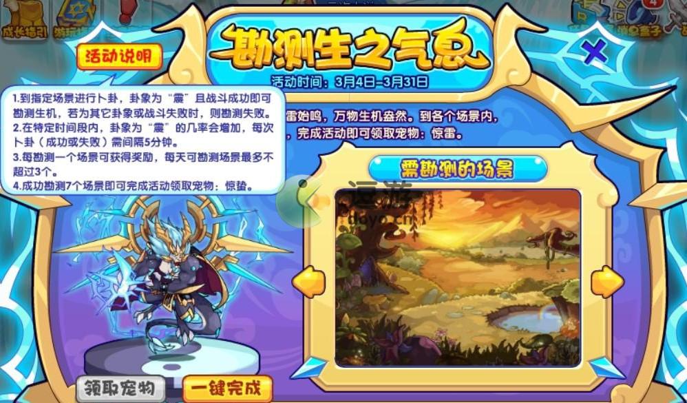 2.玩家們需要到指定場(chǎng)景進(jìn)行卜卦,卦象為震且戰(zhàn)斗成功就可以勘測(cè)生機(jī),為其他卦象則判為卜卦失敗,每天可以勘測(cè)3個(gè)場(chǎng)景,并且每勘測(cè)一個(gè)場(chǎng)景就能夠獲得獎(jiǎng)勵(lì)!