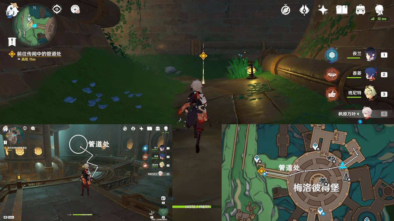 按圖中指引路線,前往管道處,與3人對話
