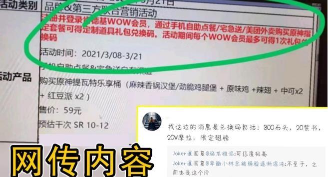 還在網(wǎng)上查到了肯德基聯(lián)動(dòng)活動(dòng)的文字消息,看樣子是內(nèi)鬼爆料。這次肯德基推出的套餐叫“提瓦特樂(lè)享桶”59元一份,送《原神》道具300原石、限定翅膀、20紫書(shū)、20萬(wàn)摩拉。如果這消息屬實(shí),那么還是挺劃算的,畢竟2頓飯還附贈(zèng)游戲道具。