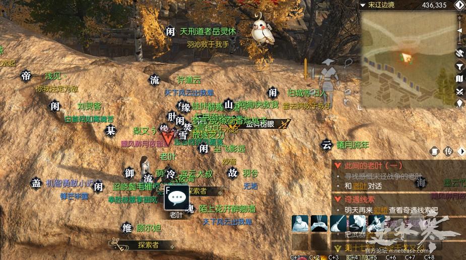 首先到宋遼邊境地圖,找不到這張地圖的可以問小暖(小地圖左邊那只鳥),再尋路至宋遼邊境(436,335)即可看見老葉,與他對話完成任務。