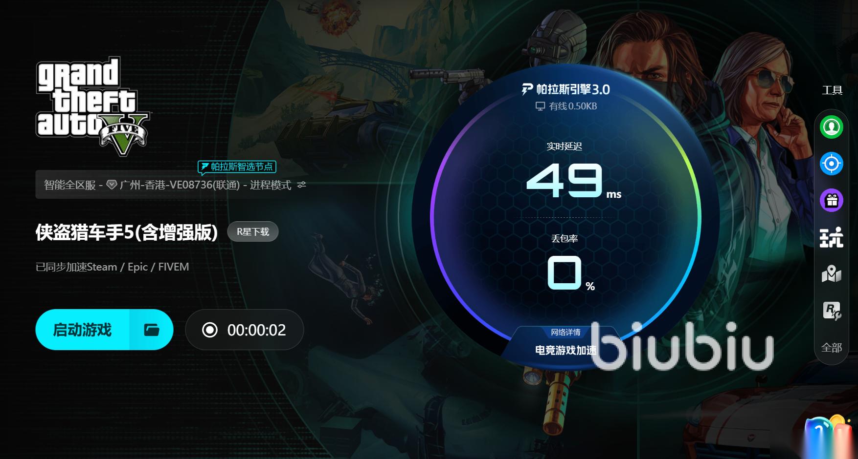 不需要學(xué)習(xí)教程,biubiu加速器一看就會(huì)用,打開(kāi)就能加速,輕松省心。進(jìn)客戶端搜GTA5,一鍵啟動(dòng)就能玩,優(yōu)化自己就完成了。臺(tái)運(yùn)行占用極低,不會(huì)影響電腦性能,兼容Rockstar Launcher等平臺(tái),保證不同渠道啟動(dòng)都能流暢。