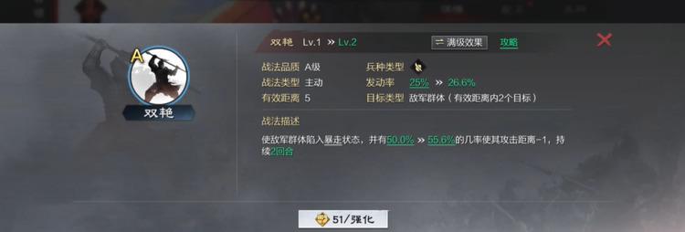 率土之濱吳美人怎么玩?吳美人指的是大小喬,這個角色的基本面板是1.14的攻擊,0.88的防御和1.55的策略。這個面板很低,雖然女武將每升級10級以上5個屬性,但策略是2:05。但是這個武將的攻城值很高,來到了恐怖的2:88,也是目前攻城最高的武將。主動戰(zhàn)術(shù)雙艷是一種主動技能,有效距離為5,也就是說,在自己的大營里,可以給對面的大營施加,發(fā)動率是40%,效果是讓對手暴走,減少攻擊距離。