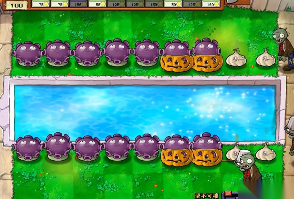 并且憂郁噴菇作為一張紫卡,不僅傷害高,而且陽(yáng)光耗費(fèi)很低,五千陽(yáng)光是完全夠用的。開(kāi)局前,可以在前方種滿一列憂郁噴菇,然后用咖啡豆將其喚醒。因?yàn)閼n郁噴菇的輸出距離比較短,所以要給它們都套上一個(gè)南瓜頭,這樣就可以保證憂郁噴菇不被高血量的僵尸啃食。