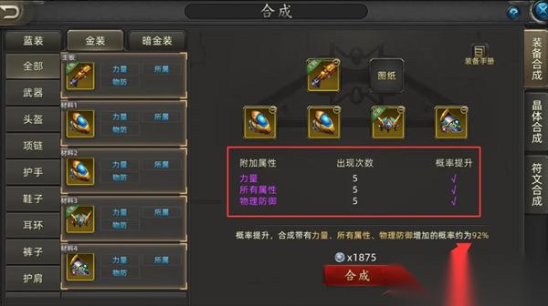 55合成:這個(gè)路子,是咱們最穩(wěn)、最推薦的玩法。簡(jiǎn)單說,就是你想繼承3個(gè)詞條,就在主板和材料里想辦法讓它們總共出現(xiàn)5次。這個(gè)方法的好處就是繼承詞條的概率高,大家看下面這張圖,我用55合法,系統(tǒng)直接告訴我繼承概率有92%。缺點(diǎn)就是湊齊這樣的裝備比較貴,成本比較大。