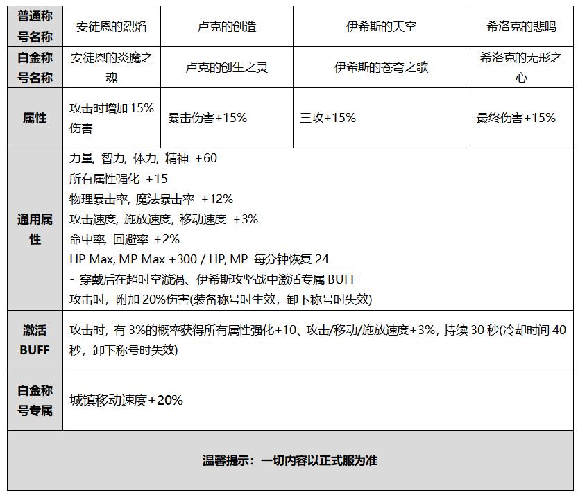 白金稱(chēng)號(hào)比普通稱(chēng)號(hào)多出一條“城鎮(zhèn)移動(dòng)速度+20%”,具體如下