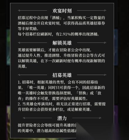 在冒險(xiǎn)者公會(huì)中,玩家可利用游戲內(nèi)免費(fèi)獲取的資源“金幣”進(jìn)行英雄刷新操作。每使用金幣刷新一次英雄列表,不僅有機(jī)會(huì)招募到新的英雄,還能為酒館聲望等級(jí)的提升貢獻(xiàn)經(jīng)驗(yàn)值。需要注意的是,使用金幣刷新到一定次數(shù)后,聲望等級(jí)就會(huì)提升。