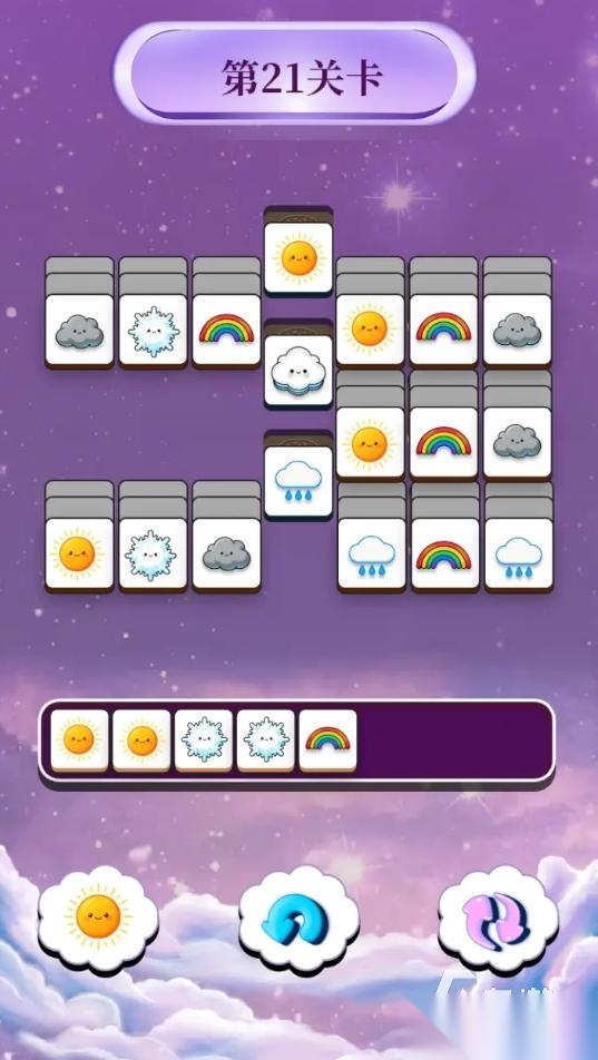《云澤天氣圖鑒》以天氣元素作為消除圖標(biāo),并在玩法方面選擇了三消模式,只要待選格里的有三個(gè)同樣的天氣圖標(biāo),它們便會(huì)自動(dòng)碰撞完成消除,進(jìn)而空出更多的待選格來(lái)方便人們繼續(xù)去進(jìn)行消除挑戰(zhàn)。只要關(guān)卡里的所有天氣圖標(biāo)都被消除掉,即可成功達(dá)成過(guò)關(guān)的要求,反之則會(huì)因無(wú)法繼續(xù)消除而挑戰(zhàn)失敗。游戲的界面風(fēng)格很簡(jiǎn)潔,整體的畫面效果會(huì)讓人覺得很是舒服,適合在休閑時(shí)用來(lái)放松。