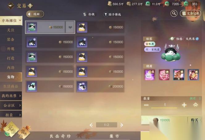 通過(guò)繁育的方式會(huì)比較麻煩,而且還要花費(fèi)紋玉來(lái)購(gòu)買(mǎi)錦囊以及使用攢下來(lái)的金丹。于是就有了最后一種方法,直接在商城交易行進(jìn)行購(gòu)買(mǎi),在市場(chǎng)攤位的寵物列表中,找到逆崽,在典藏逆崽的選項(xiàng)類(lèi)別中可以看到諸多流派逆崽。流派逆崽已經(jīng)出了很久,并不算稀有,所以?xún)r(jià)格基本在底價(jià)十五萬(wàn)銅幣,而且還能夠挑選購(gòu)買(mǎi)想要的流派的流派逆崽,如果沒(méi)有想要的可以在公示區(qū)蹲蹲。