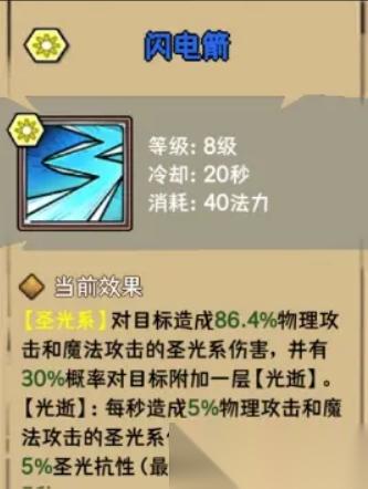 從閃電箭的描述上看,這是一個起手技能,單體傷害+疊buff:光逝(要記住這個名字,貫穿圣劍之路)