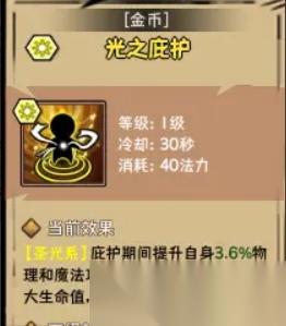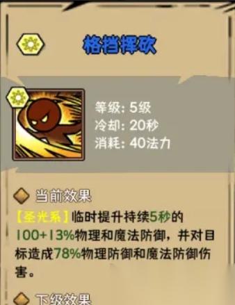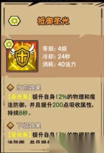 抵御圣光:這是一個防護(hù)類技能,提高自身的物理和魔法防御,并且有傷害吸收效果,同樣是目前由于等級低,基礎(chǔ)屬性低,這樣的百分比效果,暫時不是很好,后期肯定不錯,搭配格擋揮砍,應(yīng)該不錯。