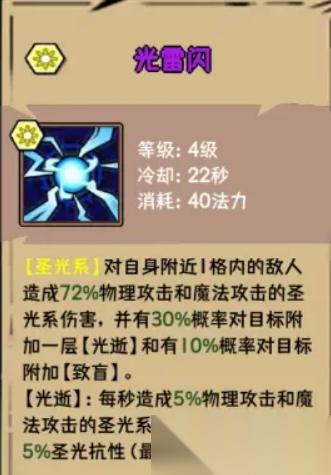 光雷閃:從技能描述上看,也是一個疊buff流派的技能,自身一格內(nèi)的敵人傷害,也就是一個小型的群體技能了,疊加buff光逝和致盲(控制技能)。效果看上文