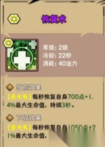 恢復(fù)術(shù):顧名思義就是一個治療技能,但是新手期自身基數(shù)太小,效果不是很明顯,從技能數(shù)值上看,后續(xù)基數(shù)高了,效果還是杠杠的。