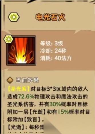 電光火石:從技能描述上看,一個3*3范圍的群體技能,疊加光逝和致盲效果