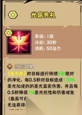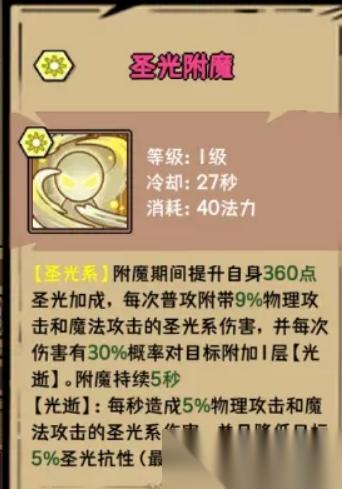 圣光附魔:應(yīng)該是光逝流的核心技能了,增幅圣光加成和普攻附帶圣光傷害,且附加光逝buff。普攻收益可以再cd期提供更高的輸出,前期技能少的時候,尤為明顯。