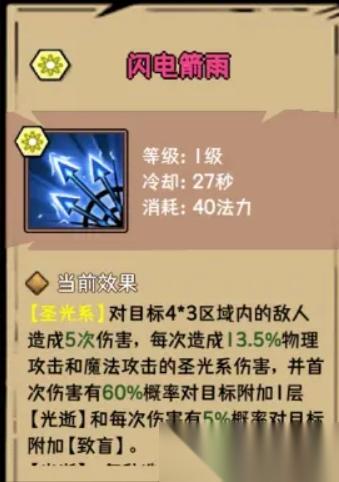 閃電箭雨:群體輸出,光逝流輸出技能,附加光逝buff和致盲效果