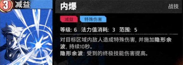 內(nèi)爆是隱形女的第二個核心技能,該技能不僅造成范圍傷害,還會為隊伍施加“隱形余波”狀態(tài),持續(xù)10秒。在此期間,我方角色的終極技能傷害將得到顯著提升。因此,內(nèi)爆通常作為爆發(fā)連招的前置技能使用,適合在隊友大招釋放前一回合施放,以最大化輸出效率。在漫威秘法狂潮的戰(zhàn)斗體系中,這種增益聯(lián)動機(jī)制使得隱形女成為團(tuán)隊爆發(fā)節(jié)奏的啟動者,尤其適合搭配高頻率釋放大招的角色共同作戰(zhàn)。