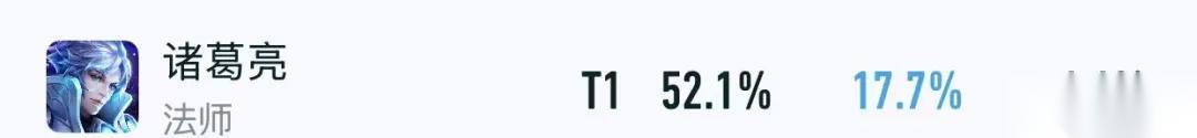 這也是諸葛亮在巔峰賽里,可以擁有52.1%勝率+17.7%出場率的原因,同理還有司馬懿,只不過因?yàn)樗F(xiàn)在前期偏弱,所以才會(huì)排在T1下游。