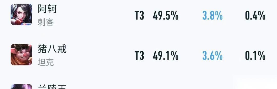 比如被形昭血脈克制還出不了肉裝的阿軻+蘭陵王,還有因?yàn)榫奕酥眨ㄈ獾叮┨缍虿怀鲆皡^(qū)壓制的豬八戒,他們的勝率和出場率都是墊底中的墊底。