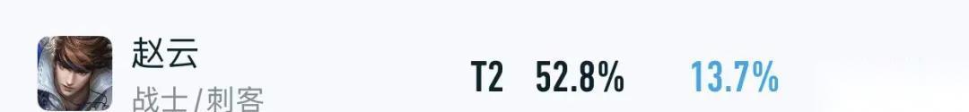趙云在多次加強(qiáng)后,全分段勝率已經(jīng)高達(dá)52.8%了,排在T2末端是完全沒問題的。
