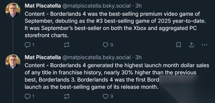 值得關(guān)注的是,9月市場(chǎng)競(jìng)爭(zhēng)激烈,《NBA 2K26》《EA FC 26》《寂靜嶺f》等多款熱門(mén)作品同期上市,均位列當(dāng)月銷(xiāo)量前二十。在此情況下,《無(wú)主之地4》依然表現(xiàn)突出,反映出該IP所具有的強(qiáng)勁市場(chǎng)吸引力。