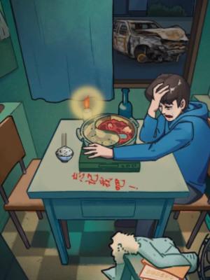 1、進(jìn)入游戲來到場景一中,我們可以在圖中找到的奇怪的地方分別有墻上的日歷、墻上的鐘表、桌子上的照片、筷子插在飯里、右滑窗簾將其打開點(diǎn)擊窗外報(bào)廢的汽車、苦惱的男人、桌子上的火鍋。