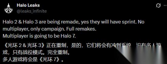 據(jù)知名消息人士Halo Leaks分享,他最近得知“《光環(huán)2》和《光環(huán)3》正在進(jìn)行重制”。此外,他還透露,這兩款游戲?qū)⑴c《光環(huán):戰(zhàn)役進(jìn)化》一樣加入奔跑機(jī)制,并且不會包含任何多人游戲內(nèi)容,Halo Studios、Xbox和微軟正計(jì)劃將多人部分留給即將到來的《光環(huán)7》。