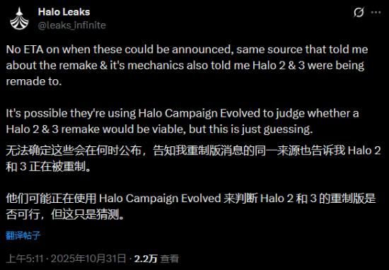 在后續(xù)的貼文中,“Halo Leaks”表示,目前這兩部重制作尚無公開時間窗口。他們稱,向其透露《光環(huán):戰(zhàn)役進(jìn)化》消息的同一消息源也提到了《光環(huán)2》和《光環(huán)3》的重制。因此他推測,Halo Studios可能是想通過公布《光環(huán):戰(zhàn)役進(jìn)化》來測試玩家反應(yīng),再決定是否推進(jìn)后續(xù)兩部重制。