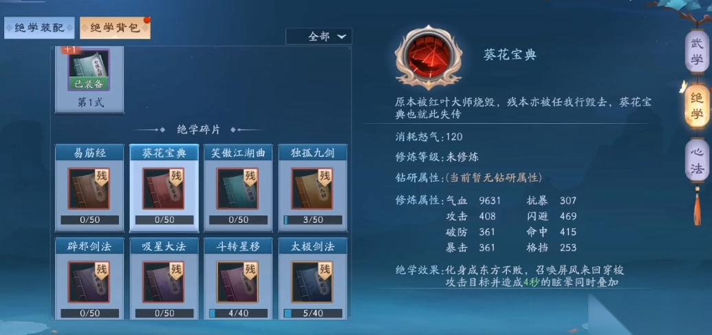 最后葵花寶典雖然強(qiáng),但獲取難度不小,得花時(shí)間慢慢攢碎片。如果咱們是休閑玩家,可以先從其他絕學(xué)入手,等資源夠了再換它。它的技能范圍雖然廣,但釋放時(shí)機(jī)很重要,別隨便亂丟,看準(zhǔn)敵人扎堆的時(shí)候再用,效果絕對(duì)驚喜。
