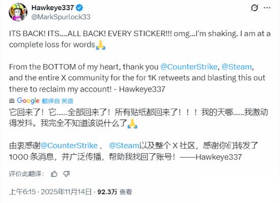 貼紙被恢復(fù)在CS歷史上幾乎從未發(fā)生過(guò)。Valve過(guò)去只有一次類似的“奇跡回檔”先例,因此不少人認(rèn)為Hawkeye的損失不可逆。但數(shù)小時(shí)后,Valve回檔了他賬號(hào),并將所有貼紙恢復(fù)成原樣。Hawkeye激動(dòng)發(fā)文:“我完全說(shuō)不出話。從心底里感謝你們。”