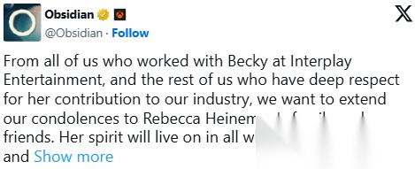 黑曜石娛樂在推文中寫道:“曾與貝琪在Interplay共事的同仁,以及所有深切感念她為行業(yè)帶來貢獻(xiàn)的伙伴,在此向麗貝卡·海涅曼的親友致以哀思。她的精神將永遠(yuǎn)留存于受其啟迪、愛戴她的人們心中?!?/p>