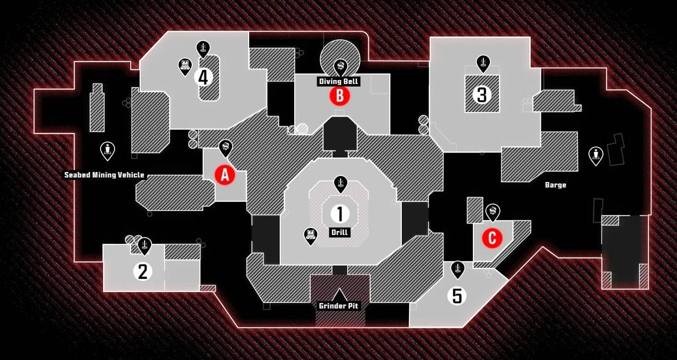 本篇為大家?guī)淼氖鞘姑賳竞谏袆?的小型地圖黑心地圖的地圖點位,這張圖適用于6對6和2對2,戰(zhàn)場設在公海上的“公會”鉆井平臺,玩家可在此開采海洋關鍵資源,戰(zhàn)斗地點比較多,可以在中央鉆塔周圍展開激戰(zhàn),也能推進到裝有礦物集裝箱、泵站和巨型海上機械的駁船處作戰(zhàn)。