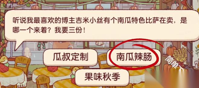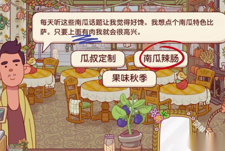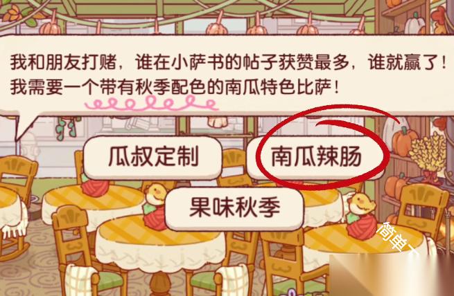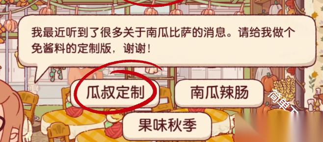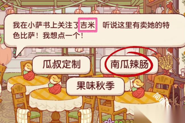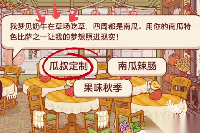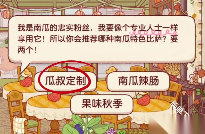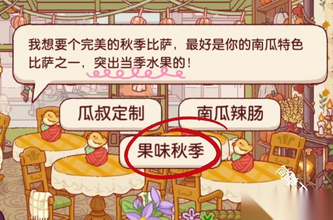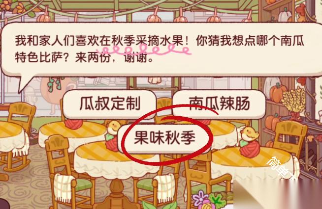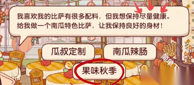可口的披薩秋季南瓜節(jié)活動中有3款可制作的南瓜披薩,同時還需根據(jù)顧客所說的人物角色來猜測對方的訂單。盡量健康是果味秋季、定制版是瓜叔定制、吉米小絲是南瓜辣腸、秋季配色是南瓜辣腸、吉米推薦的是南瓜辣腸、奶牛在草地吃草是瓜叔定制、專業(yè)人士享用是瓜叔定制、突出當(dāng)季水果的是果味秋季、秋季采摘水果的是果味秋季、上面有肉的是南瓜辣腸。