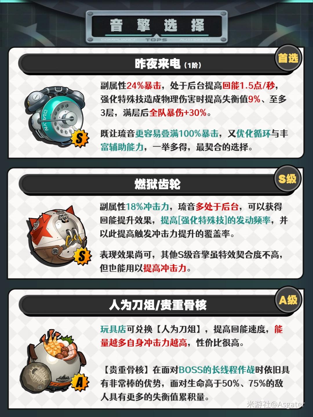 ① 作為擊破角色,其專武卻副屬性并不提供沖擊力而提高暴擊率,用以回應(yīng)核心被動(dòng)(F級(jí))中“超出50%初始暴擊率的部分,將按1:2的方式提高沖擊力、至多100點(diǎn)”,是其他擊破音擎都難以“挑戰(zhàn)”的,能讓琉音更輕松地堆滿暴擊率。