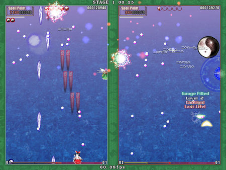 1.是一款縱版彈幕射擊對戰(zhàn)游戲,游戲中兩位角色在兩個獨(dú)立的游戲區(qū)(亦稱做分屏)中進(jìn)行彈幕對戰(zhàn)。