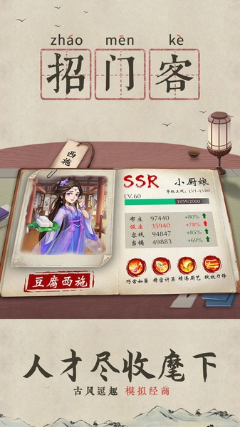 玩家可以通過創(chuàng)立商會、建立商圈,進而提升自己的名望,才能有機會結(jié)識各類門客,在招募門客時需要在“商戰(zhàn)”中展現(xiàn)伸手。