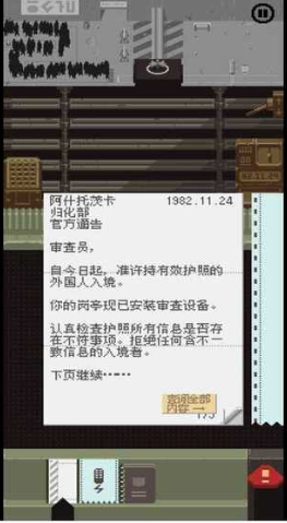 請(qǐng)出示證件官方正版游戲背景設(shè)定在一個(gè)虛構(gòu)的極權(quán)主義國(guó)家Arstotzka,請(qǐng)出示證件官方正版時(shí)間背景為冷戰(zhàn)時(shí)期的1980年代。玩家在游戲中扮演一名邊防檢查員,負(fù)責(zé)審核入境人員的文件,決定是否批準(zhǔn)其進(jìn)入國(guó)境。游戲不僅僅是一個(gè)簡(jiǎn)單的文檔檢查模擬,更是一個(gè)關(guān)于道德抉擇、生存挑戰(zhàn)與個(gè)人與國(guó)家利益沖突的深刻故事。