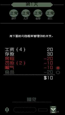 資源管理:玩家需在有限的工資和家庭開(kāi)支間做出平衡,以保證家人的健康和幸福。