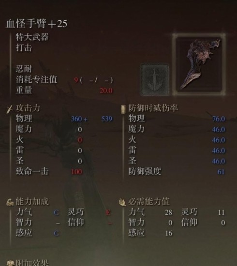 屬性加點上,這把血怪手臂能力要求28力氣、11靈巧、16感應(yīng),能力加成力氣C、靈巧E、感應(yīng)B,因此主點感應(yīng)和力氣,和一點點的靈巧,因為武器出血的數(shù)值被感應(yīng)影響,感應(yīng)越高出血越高,可以高達200多的出血數(shù)值,1~2下攻擊就能打出出血,而且這把武器的感應(yīng)能力加成也有B,所以最重要的感應(yīng)不能少點,剩下有多余的點數(shù),再點到力氣和靈巧即可。