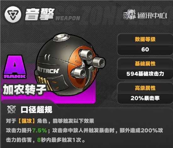 副詞條暴擊率,特效加攻和額外倍率,十分泛用的一個(gè)強(qiáng)攻用音擎。如果你有11號、艾蓮或者貓又而且主練,目前又抽不到專武。那幺加農(nóng)轉(zhuǎn)子是一個(gè)非常不錯的選擇,尤其是對沒有專武的艾蓮來說。