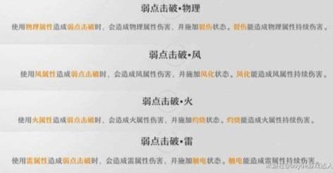 物理,風,火,雷弱點擊破后都是造成相應的持續(xù)傷害,需要注意這里不同屬性間是沒有元素反應的,各論各的!