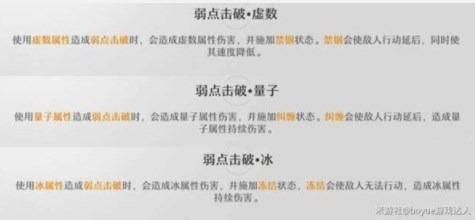 虛數(shù)與量子弱點擊破后都能使敵人行動延后,然后虛數(shù)附帶減速,量子則是持續(xù)傷害,冰是最特別的,目前版本唯一帶控制的屬性,能夠凍結敵人同時造成持續(xù)傷害(不過凍結狀態(tài)會被打碎需要注意)。